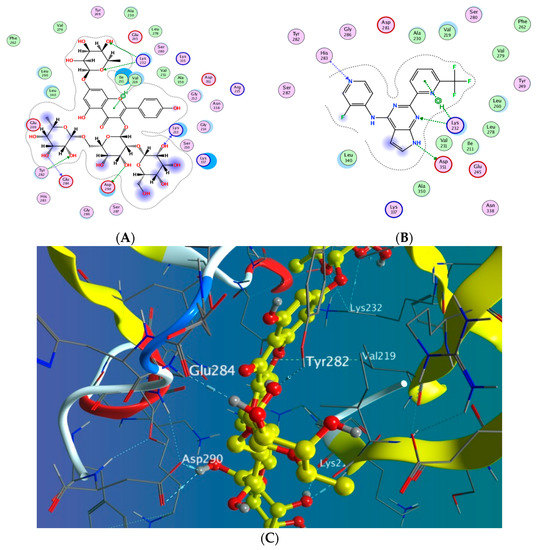 Various physicochemical properties could greatly influence the bioactivity of a given drug as it is closely related to the interactions between the drug and its potentially suspected target. Recently in silico approaches introduce a powerful tool for drug discovery to assess the proposed pharmacokinetics (ADME) of compounds which play a vital role in their pharmacological activities, specially at the early stages of screening for lead compounds [60]. Consequently, the measurement of these parameters is of great value in the selection of an efficient drug candidate. Lipinski and Veber rules are successful tools to perform such screening as Lipinski’s rule of five states that a compound has drug-like activity if at least 3 of the following criteria were achieved. A molecular mass less than 500 Da, a maximum of five hydrogen donors, a maximum of 10 hydrogen bond acceptors, and a partition coefficient between octanol and water (LogP (o/w)) smaller than 5 [61]. According to Veber’s rule, the compound is orally active if it has 10 or less rotatable bonds with a polar surface area (PSA) not less than 140Å [62]. For predicting drug likeness properties, we used Reaxys [63]. The screening of the 19 phytochemicals revealed that all of them complied with Lipinski and Veber rules except for compound 15 that does not obey the two rules, and this might be attributed to the large glycosidic moiety attached to the compound (Figures S1–S19, Supplementary File).