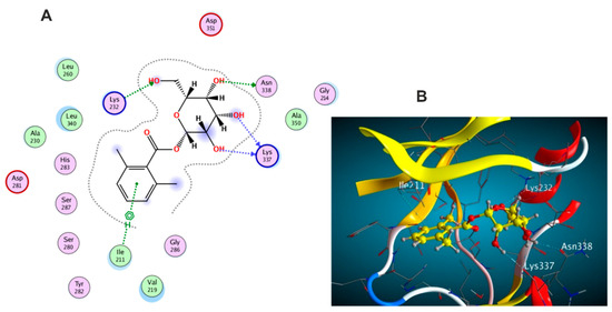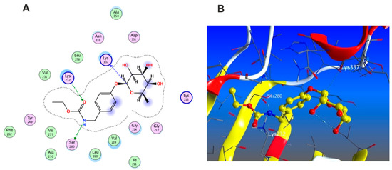 The docking results of the 19 compounds against (6B8Y) are summarized in Supplementary Table S3. Representative compounds with potential affinity were presented in Figure 10, Figure 11, Figure 12, Figure 13 and Figure 14. The docking results revealed that compound 14 showed the highest affinity towards the protein (6B8Y) as it recorded the lowest energy score among the screened compounds and also much lower than co-crystalized ligand with score of −10.186 kcal/mol. The binding involved seven hydrogen bond interactions, of which three form H-donor with Lys 213, Asp 290, and Glu 284 and the other four form H-acceptor with Lys 213, Tyr 282, and Lys 232 besides one pi-H interaction between the pyrone moiety and Val 219 residue. Compound 16 similarly showed better energy score than ligand −7.654 kcal/mol) forming three hydrogen bonds with the docked receptor, of which one forms H-acceptor with Lys 232 (resembling that formed by the co-crystalized ligand) and another two as H-donor with Ser 280 and Lys 337.
