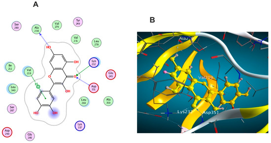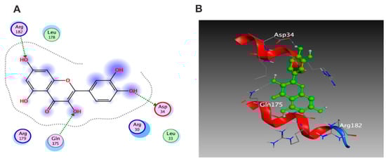 (A)2D interaction of quercetin with amino acid residues (B) 3D pose in the active pocket site IL6 (PDB ID code:1ALU).