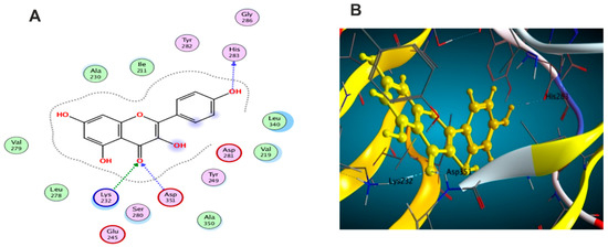 (A) 2D interaction of kaempferol with amino acid residues (B) 3D pose of kaempferol in the active pocket site MMP2 (PDB ID code:1HOV).