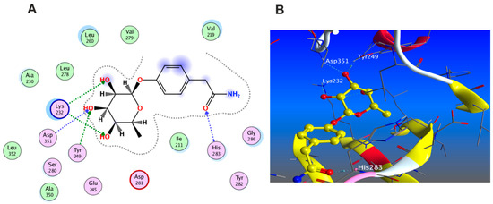 The X-ray crystallographic structure of (TGF-β) complexed with its novel pyrrolopyrimidine ligand was obtained from the protein data bank (http://www.rcsb.org/pdb/, code 6B8Y (accessed on 10 April 2022). TGF-β is transmembrane serine/threonine kinase that phosphorylate SMAD proteins which will in turn be dimerized and translocated to the nucleus followed by gene transcription [50]. To validate our study, the ligand was re-docked with its active binding site showing hydrogen bond formation between the pyrrole NH and the carbonyl of Asp 351. Two hydrogen bonds are formed with Lys 232 and His 283 through the nitrogen of the pyrimidine ring and the pyridinyl moiety, respectively, in addition to one hydrophobic interaction with Lys 232 (Figure 9). The docking algorithm was able to predict the co-crystalized ligand pose with least RMSD with energy score of −7.555 kcal/mol.