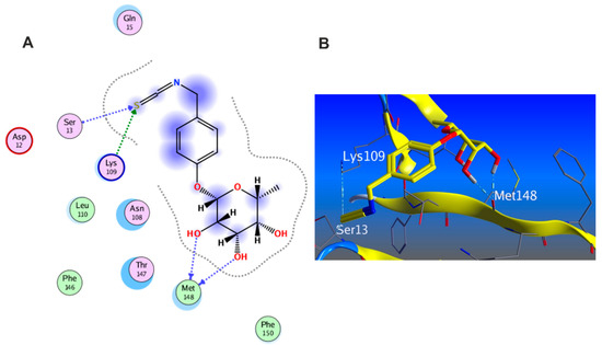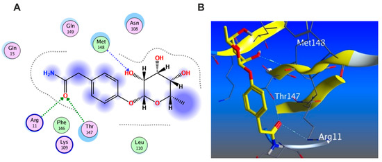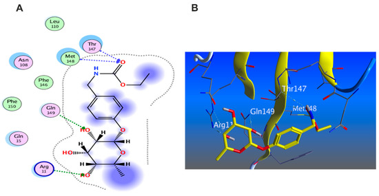 Remarkably, compounds 1, 15, 16, and 18 achieved an energy score of compound-receptor complex lower than the co-crystallized ligand with scores of −5.023, −5.352, −5.541 and −5.118, respectively. Compound 16 showed similar hydrogen bond interactions as the ligand with the same amino acids Met 148, Arg 11, Thr 147, and Gln 149 (Figure 15). Some compounds which recorded comparable energy score results displayed good interactions that greatly resemble the ligand interactions; this was obvious in compounds 2, 7, and 8, while other compounds showed higher energy score than the ligand.