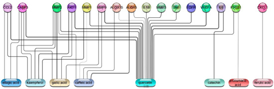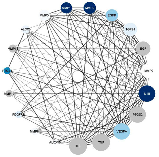 We constructed two networks (Figure 19 and Figure 20). The Protein–Protein Interaction (PPI) Network which displayed the interactions between proteins related to wound healing. The suggested proteins that were expected to be involved in wound healing process were submitted to the STRING application (https://string-db.org/) (accessed on 2 June 2022) [56] for protein–protein interaction (PPI) analysis, selecting “Homo sapiens” as the type of species. The confidence score was set to 0.4 on the default settings for the rest of the parameters to achieve the PPI network. The constructed was network created by Cytoscape 3.9.1 (https://www.cytoscape.org/) (accessed on 5 June 2022) [57], a software package for visualizing and analyzing networks. It is considered a weighted network where the edge weights correspond to the STRING confidence score associated with the PPI (edge). Utilizing the network analyzer tool in Cytoscape, we observed that the network comprised of 19 nodes, 119 edges, and the average number of neighbors was 12.5. The topological parameters such as node degree, betweenness, closeness and the strength of skin tissue expression of each protein are summarized in Table 2. The median of the degree, betweenness, and closeness in the network were 13,0.007625272 and 0.782608696, respectively. The network was visualized in a circular layout using “yFiles circular layout” tool in Cytoscape software and was sorted by linking the size of the nodes with the degree of connectivity. Another classification in the form of color intensity of the nodes and their score of skin tissue expression (the main site of action in wound healing process) is included.