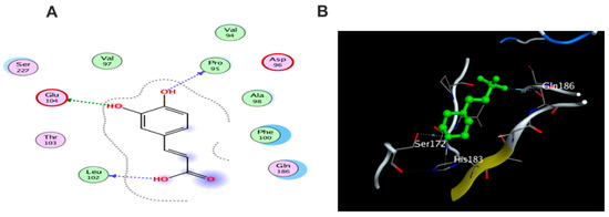 (A)2D interaction of caffeic acid with amino acid residues (B) 3D pose in the active pocket site MMP1 (PDB ID code:1SU3).