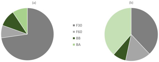 The results obtained indicate that if we would have kept only the F30 fraction for the characterization of the total phenols of the orange juice by-product powder, we would be losing 27.2% of the TP in the sample, of which 7.8%, 10.2%, and 9.2% would be in fractions F60, BB, and BA, respectively (Figure 2a). On the other hand, the two extractions with MeOH at 30 and 60 °C allow the extraction of all the free phenols, which account for 80.6% of the total, with the remaining fraction represented by bound phenolics that required basic and acidic extraction for 24 h for release. These findings are consistent with Alu’datt et al. [21], who showed that most phenolics are found in the free form in different fruits of the Rutaceae family (85–93% of the total phenolic content).