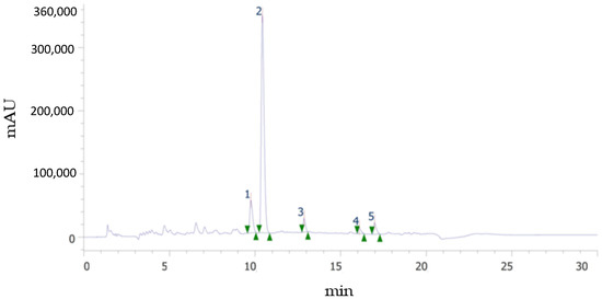 Example of chromatogram showing the flavonoid profile of the sample. (1) Narirutin. (2) Hesperidin. (3) Didymin. (4) Sinensetin. (5) Nobiletin.