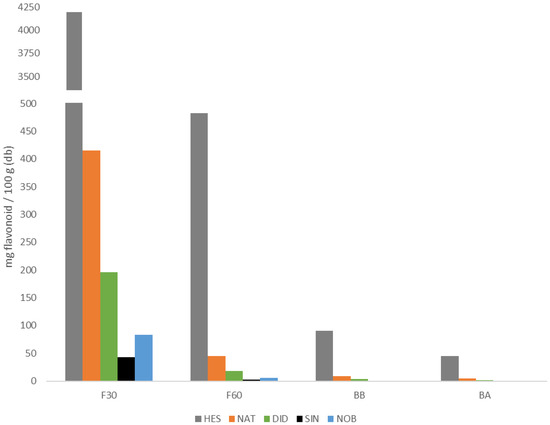 Figure 4 shows the content of each of the flavonoids identified in each of the four extracts analyzed and Table 1 shows both the sum of all of them for each fraction (Fi) and the sum of all four fractions, the latter being the total amount of flavonoids identified in the powdered orange juice by-product. The main flavonoids found in each phenolic fraction were hesperidin and narirutin. As can be observed, the highest amount of flavonoids was found in F30, followed by the F60 free phenolic fractions. Between 90% and 95% of each of the quantified flavonoids (NAT, HES, DID, SIN, and NOB) were found in the free fractions, being between 86% and 94% in F30. Although the bound flavonoids present in the BA and BB fractions do not contribute much to the total, it is sufficient to take them into account, especially the BB fraction.