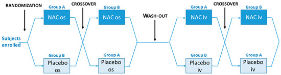 A placebo-controlled crossover study, single-blinded, was performed on 6 hypertensive subjects, randomized in two groups, on a one-to-one basis with NAC (600 mg/die) or placebo (Figure 1), orally administered. Indeed, hypertension is a condition associated with oxidative stress [16]. Blood was collected at different time points (basal, 30 min, 1 h, 2 h, 4 h, 6 h, and 24 h after NAC or placebo administration) to evaluate the time-dependent effect of NAC on the reduction of Thio-HSA and on the redox balance. After one month of wash-out, the two groups were crossed over. The same scheme described above was applied to the same 6 patients treated with NAC or placebo, by intravenous infusion (i.v.) (slowly infused for 10 min, diluted in 20 mL of saline solution), after the wash-out period.