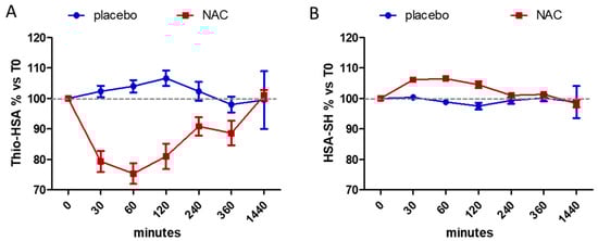 Effects of oral administration of NAC or placebo on albumin isoforms, Thio-HSA (A) and HSA-SH (B). Data are expressed as mean ± SEM of the percentage with respect to T0 values. Two-way ANOVA was used to assess the effect of treatment (p = 0.0006 and p = 0.027 for Thio-HSA and HSA-SH, respectively).