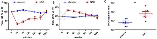 Effects of intravenous administration of NAC or placebo. Mass spectrometry evaluation of albumin isoforms, Thio-HSA (A) and HSA-SH (B), at different time points from NAC or placebo administration. Data are expressed as mean ± SEM of the percentage with respect to T0 values. Two-way ANOVA was used to assess the effect of treatment (p < 0.0001 for both Thio-HSA and HSA-SH). (C) Total plasma antioxidant activity measured by TRAP assay after 30 min from NAC or placebo administration. Data are presented as circle plot, with each circle representing an individual patient and bars showing the mean value ± SEM. ** p < 0.01 calculated by Student’s t test.