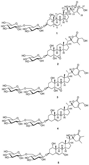 Accordingly, we examined the BuOH fraction to identify constituents mediating in vitro cytotoxicity against HepG2 cells. Chemical assessment of the active BuOH fraction using repeated column chromatography and semi-preparative high-performance liquid chromatography (HPLC), along with LC/MS analysis using an in-house-built UV library database, resulted in the isolation of five withanolide glycosides (1–5) (Figure 2).