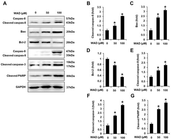 Effects of withagenin A diglucoside (WAD) (3) on apoptosis signaling pathways in human hepatocellular carcinoma (HepG2) cells. HepG2 cells were treated with WAD (50 and 100 μM) for 24 h. Cells were treated with culture media containing 0.5% DMSO as vehicle controls: (A) Protein expression levels of cleaved caspase-8, Bcl-2-associated X protein (Bax), B-cell lymphoma 2 (Bcl-2), cleaved caspase-9, cleaved caspase-3, cleaved poly(ADP-ribose) polymerase (cleaved PARP), and glyceraldehyde-3-phosphate dehydrogenase (GAPDH). (B–G) Each bar graph presents the densitometric quantification of protein expression levels. Data are presented as the mean ± standard error of the mean (SEM). n = 3, * p < 0.05 compared with the control.