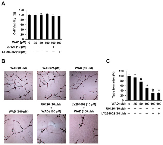 Initially, a cell viability assay was performed to evaluate the non-toxic concentrations of WAD in HUVECs, treated with WAD (25, 50, and 100 μM), U0126 (10 μM), and/or LY294002 (10 μM) for 24 h. HUVEC viability was assessed using the MTT assay. Treatment with WAD (25, 50, and 100 μM), U0126 (10 μM), and LY294002 (10 μM) did not affect HUVEC viability (Figure 9A). These non-toxic concentrations were employed to evaluate tube formation in HUVECs. On incubating HUVECs with WAD (25, 50, and 100 μM), tube formation was reduced by 76.38 ± 3.41 and 51.36 ± 2.75% at 50 μM and 100 μM, respectively. These effects were enhanced following co-treatment with a mitogen-activated protein kinase (MEK)/extracellular signal-regulated kinase (ERK) inhibitor (U0126) or a phosphatidylinositol 3-kinase (PI3K) inhibitor (LY294002). Incubation of HUVECs with 100 μM WAD and 10 μM U0126 reduced tube formation by 30.58 ± 4.81%. Treatment with 100 μM WAD and 10 μM LY294002 reduced tube formation by 30.48 ± 2.76% (Figure 9B,C).