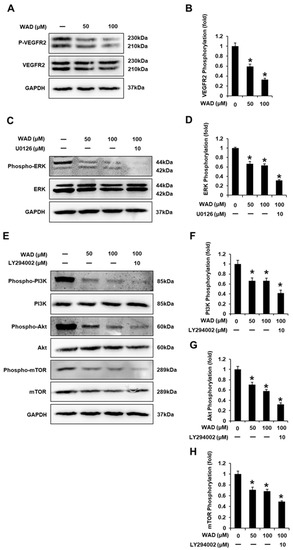 Western blotting was performed to determine protein expression levels and evaluate the potential molecular mechanisms of WAD on HUVEC tube formation. Treatment with WAD (50 and 100 μM) decreased VEGFR2 phosphorylation (Figure 10A,B). In addition, treatment with WAD (50 and 100 μM) reduced ERK phosphorylation. This effect was enhanced by co-treatment with 10 μM U0126 (Figure 10C,D). Treatment with WAD (50 and 100 μM) decreased the phosphorylation of phosphoinositide 3-kinase (PI3K), Akt, and mammalian target of rapamycin (mTOR), which was enhanced by co-treatment with 10 μM LY294002 (Figure 10E–H). These results indicated the potential mechanism of action of WAD on the angiogenesis of HUVECs.