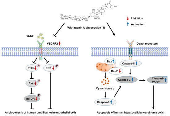 In conclusion, bioactivity-guided fractionation of the MeOH extract of W. somnifera roots and phytochemical investigation of the active n-BuOH-soluble fraction resulted in the isolation of five withanolide glycosides (1–5), including a new compound, withanoside XIII (1), via LC/MS-based analysis. The structure of withanoside XIII was determined based on 1D and 2D NMR spectroscopic, HR-ESIMS, and ECD data, along with enzymatic hydrolysis, which afforded a new compound, withanoside XIIIa (1a), an aglycone of 1. Among isolated compounds, WAD (3) exhibited the most potent cytotoxicity against human HCC cells (HepG2), which was mediated by both extrinsic and intrinsic apoptosis pathways. Treatment with WAD increased the protein expression levels of cleaved caspase-8, Bax, cleaved caspase-9, cleaved caspase-3, and PARP but decreased Bcl-2 expression. In addition, WAD inhibited tubular structure formation of HUVECs by suppressing VEGFR2 and its downstream pathways, including ERK, PI3K, Akt, and mTOR, thereby elucidating the mechanisms underlying its anti-angiogenic effect. These findings provide experimental evidence for the antitumor potential of WAD (3) on anti-angiogenic and apoptotic properties in human HCC cells, suggesting its potential application in treating liver cancers.