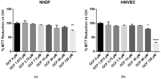 Figure 1. MTT assay on normal cells. NHDF (Neonatal Human Dermal Fibroblasts) (a) and HMVEC (Human Microvascular Endothelial Cells) (b) are non-transformed cell cultures and these were used in order to test their vitality using an OCF dose-dependent treatment through a MTT test. Data are presented as mean ± SD; * p < 0.05; ** p < 0.01; **** p < 0.0001 (One-way ANOVA Dunnett’s multiple comparison test).