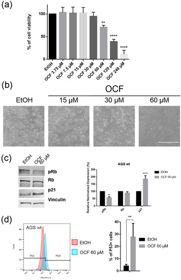 Figure 2. Effects of different doses of OCF on AGS wt cells. AGS wt cells, treated for 72 h with vehicle or different doses of the OCF, were analyzed through a MTT assay (a); pictures were obtained with an inverted microscope at 4× magnification (b); representative western blot analysis of phosphor-Rb (p-Rb), Rb, p21 and vinculin levels in the AGS wt treated with vehicle or 60 µM dose of the OCF for 24 h and the corresponding densitometry (c). Flow cytometry plots for the p53 staining and the corresponding histograms (d). Results of the representative experiments are shown. ** p < 0.01, **** p < 0.0001. (a) One-way ANOVA Dunnett’s multiple comparisons test; (c,d) Two-way ANOVA Sidak’s multiple comparisons test.