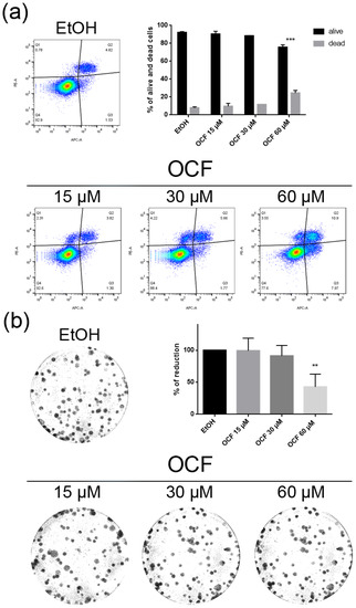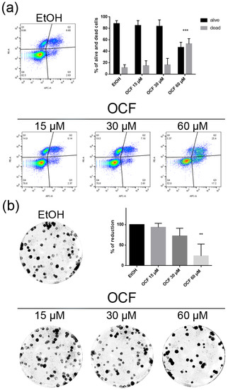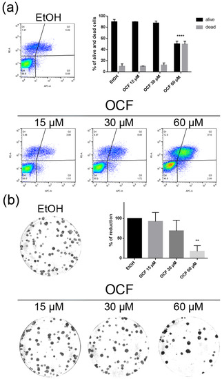 Figure 5. Vitality and colony formation assay of the OCF-treated 5FUr cells. 5FUr cells were treated for 72 h with vehicle or with different doses of the OCF; plots and corresponding histograms for live/dead cells percentages obtained by an annexin V/PI double staining are shown (a). Cell colonies obtained after 72 h of the vehicle/OCF treatment and the corresponding percentage quantification (b). Data are presented as mean ± SD of three independent experiments. Results of the representative experiments are shown. ** p < 0.01, *** p < 0.001. (a) Two-way ANOVA Tukey’s multiple comparisons test; (b) One-way ANOVA Dunnett’s multiple comparisons test.