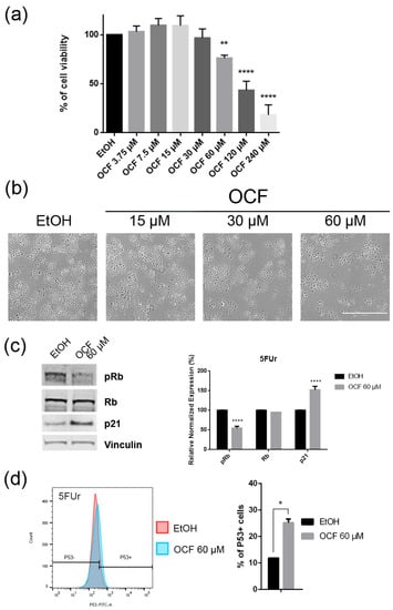 Figure 4. Effects of different doses of OCF on the 5FUr cells. 5FUr cells, treated for 72 h with vehicle or with different doses of the OCF, were analyzed through a MTT assay (a); pictures were obtained with an inverted microscope at 4x magnification (b); representative western blot analysis of p-Rb, Rb, p21 and vinculin levels in 5FUr cells were treated with vehicle or 60 µM dose of the OCF for 24 h and the corresponding densitometry (c). Flow cytometry plots for the p53 staining and corresponding histograms (d). Data are presented as mean ± SD of three independent experiments. Results of the representative experiments are shown. * p < 0.05, ** p < 0.01, **** p < 0.0001. (a) One-way ANOVA Dunnett’s multiple comparisons test; (c,d) Two-way ANOVA Sidak’s multiple comparisons test.