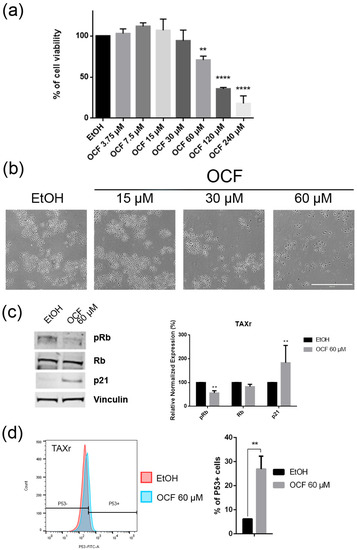 Figure 6. Effects of the different doses of the OCF on TAXr cells. TAXr cells, treated for 72 h with vehicle or with different doses of the OCF, were analyzed through a MTT assay (a); pictures were obtained with an inverted microscope at 4x magnification (b); representative western blot analysis of p-Rb, Rb, p21 and vinculin levels in the TAXr cells treated with vehicle or 60 µM dose of the OCF for 24 h and the corresponding densitometry (c). Flow cytometry plots for the p53 staining and the corresponding histograms (d). Data are presented as mean ± SD of three independent experiments. Results of the representative experiments are shown. ** p < 0.01, **** p < 0.0001. (a) One-way ANOVA Dunnett’s multiple comparisons test; (c,d) Two-way ANOVA Sidak’s multiple comparisons test.