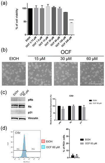 Figure 8. Effects of different doses of OCF on the CISr cells. CISr cells treated for 72 h with vehicle or with different doses of the OCF, were analyzed through a MTT assay (a); pictures were obtained with an inverted microscope at 4× magnification (b); representative western blot analysis of p-Rb, Rb, p21 and vinculin levels in the CISr cells treated with vehicle or with 60 µM dose of the OCF for 24 h and the corresponding densitometry (c). Flow cytometry plots for the p53 staining and the corresponding histograms (d). Data are presented as mean ± SD of three independent experiments. Results of the representative experiments are shown. (a) One-way ANOVA Dunnett’s multiple comparisons test; (c,d) Two-way ANOVA Sidak’s multiple comparisons test. **** p < 0.0001.