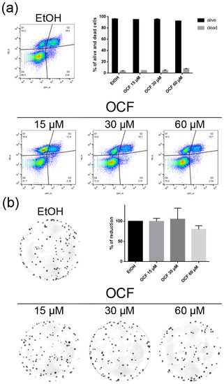 Figure 9. Vitality and the colony formation assay of the OCF-treated CISr cells. CISr cells were treated for 72 h with vehicle or with different doses of the OCF; plots and corresponding histograms for live/dead cells percentages obtained by an annexin V/PI double staining are shown (a). Cell colonies obtained after 72 h of the vehicle/OCF treatment and the corresponding percentage quantification (b). Data are presented as mean ± SD of three independent experiments. Results of the representative experiments are shown. (a) Two-way ANOVA Tukey’s multiple comparisons test; (b) One-way ANOVA Dunnett’s multiple comparisons test.