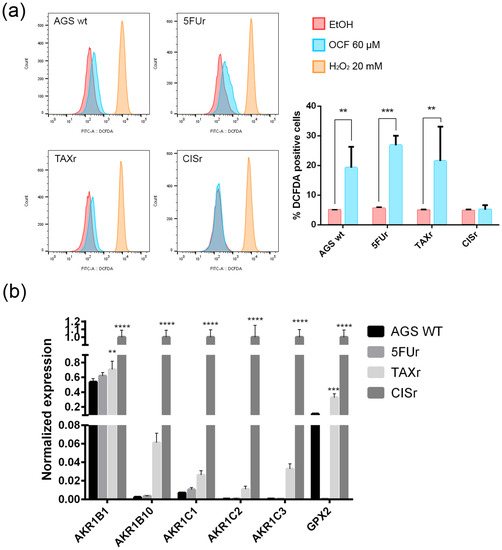 The following literature indications reported an increase in the production of reactive oxygen species (ROS) in OC-treated colorectal and hepatocellular carcinoma cells, see Cusimano et al. [26]. We decided to verify whether the OCF-dependent toxicity observed in our cells may depend on the ROS production. The OCF-dependent ROS production may also be suggested by the increased level of p53 following the OCF treatment (Figure 2d, Figure 4d and Figure 6d); indeed, p53 is implicated in the cellular response of several sources of stress, including the ROS [40]. We verified that the 60 µM dose of the OCF induced the ROS increase in all of the tested cells except for the CISr cells, as revealed by the flow cytometry DCFDA assay (Figure 10a). Considering that the AGS wt, 5FUr and TAXr cells showed lower expression levels of a number of antioxidant genes, such as AKR1B, AKR1B10, AKR1C1, AKR1C2, AKR1C3 and GPX2, while the CISr expressed a high level of these protective genes, it is possible that the lack of the OCF-induced ROS production in the CISr cells may depend on this specific feature (Figure 10b).