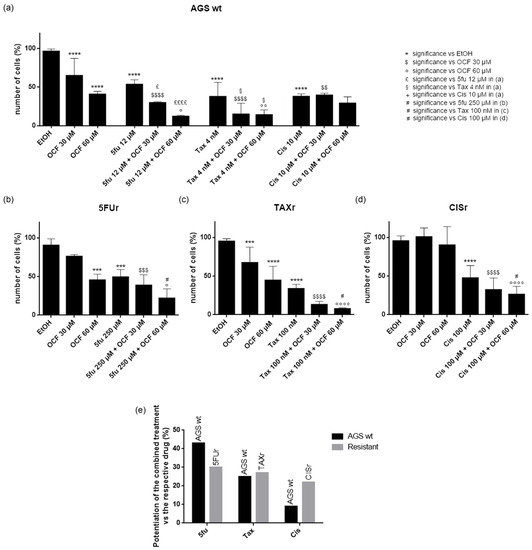 In order to test a possible potentiation effect of the OCF in the toxicity of 5-fluorouracil, cisplatin or Paclitaxel on AGS wt and resistant cells, we decided to use drugs at the IC50 dose for each cell type, as determined in [37] and reported in Figure 11. We found that in the AGS wt cells, the 60 µM dose of the OCF potentiated the effect of all of the drugs, namely 5-fluorouracil, Paclitaxel and cisplatin, as assessed by the decrease in the viable cells (Figure 11a). The same potentiating activity was also found when the 60 µM dose of the OCF was combined with 5-fluorouracil or Paclitaxel in order to treat the 5FUr or TAXr cells, respectively (Figure 11b,c). The enhancing effect of the 60 µM dose of the OCF on the cisplatin-treated CISr cells (Figure 11d) is extremely interesting, since the 60 µM dose of the OCF alone was ineffective in the CISr. Therefore, the OCF is able to potentiate a drug toxicity in all AGS resistant cells (Figure 11e) and the latter discovery is important in view of the polychemotherapy approach used in GC.