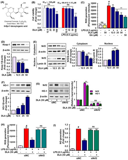 Antioxidant effects of DLA in RAW 264.7 cells. Chemical structure of 8-Epi-7-deoxyloganic acid (DLA) (A), A 96-well plate was seeded with cells (2 × 105 cells/mL) and incubated for 24 h; Following this, the cells were exposed to DLA (12.5–50 µM) or vehicle alone for 20 h and/or for 3 h, then LPS (500 ng/mL) was added, and incubation was continued for 24 h. DLA impact on cell viability (B); ** p < 0.05 vs. treatment with vehicle and LPS alone, ns: non-significant vs. treatment with vehicle and LPS. DLA effects on intracellular reactive oxygen species (ROS) scavenging (C); # p < 0.05 vs. treatment with vehicle control; ** p < 0.05 vs. treatment with LPS alone, ns: non-significant vs. treatment with vehicle. Western blot analysis was used to identify the expression of Kelch-like ECH-associated protein 1 (Keap-1) (D), nuclear factor erythroid 2-related factor 2 (Nrf2) in both cytosol and nuclear fractions (E), and hemeoxygenase 1 (HO-1) (F); ** p < 0.05 vs. treatment with vehicle control. According to the procedure outlined in the materials and methods, the cells were treated with siRNA for Nrf2 (si-Nrf2) with or without DLA; The protein levels of Nrf2 and HO-1 were then determined by immunoblotting (G); To quantify the relative band intensities, densitometric analysis was performed; ** p < 0.05 vs. treatment with siNC, ns: non-significant vs. treatment with siNrf2. The production of cellular ROS (H) and nitric oxide (NO) (I) was measured; ** p < 0.05 vs. treatment with siNC, ns: non-significant vs. treatment with siNrf2.