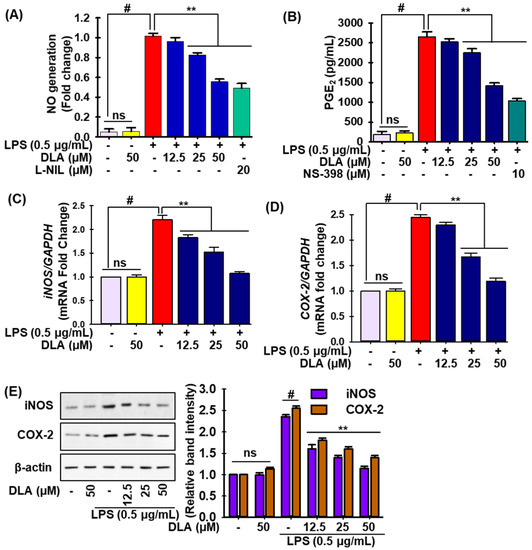 Anti-inflammatory effects of DLA. A 96-well plate was seeded with cells (2 × 105 cells/mL) and incubated for 24 h. Following this, the cells were exposed to the DLA (12.5–50 µM) or vehicle alone for 20 h and/or for 3, then to LPS (500 ng/mL) for 24 h of incubation. Effect of DLA in LPS-induced RAW 264.7 macrophages on the production of NO (A) and prostaglandin E2 (PGE2) (B) and on the mRNA expression of inducible nitric oxide synthase (iNOS) (C) and cyclooxygenase-2 (COX-2) (D); protein expression of iNOS and COX-2 (E). To evaluate the quantification of the relative band intensities, densitometric analysis was performed; # p < 0.05 vs. treatment with the vehicle control; ** p < 0.05 vs. treatment with LPS alone. ns: non-significant vs. treatment with vehicle control.