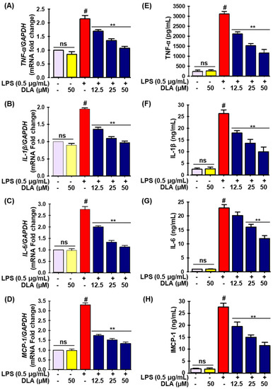 DLA impact on the production of proinflammatory cytokines and chemokine. A 96-well plate was seeded with cells (2 × 105 cells/mL) and incubated for 24 h. Following this, the cells were exposed to DLA (12.5–50 µM) or vehicle alone for 20 h and/or for 3, then to LPS (500 ng/mL), and finally they were incubated for 6 h. DLA impact on LPS-induced RAW 264.7 cells mRNA expression of tumor necrosis factor-α (TNF-α), interleukin-1β (IL-1β), interleukin-6 (IL-6), and monocyte chemoattractant protein-1 (MCP-1) (A–D) and protein expression (E–H). # p < 0.05 vs. treatment with vehicle control; ** p < 0.05 vs. treatment with LPS alone. ns: non-significant vs. treatment with vehicle control.