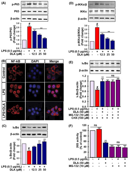 Effect of DLA on the nuclear factor kappa-light-chain-enhancer of activated B cells (NF-κB) signaling pathway. The cells were pretreated with DLA (12.5, 25, and 50 μM) for 12 h before being exposed to LPS (500 ng/mL) for 1 h. Immunoblot analysis was performed to evaluate the protein levels of p-p65 and p65 (A); # p < 0.05 vs. vehicle-treated control; ** p < 0.05 vs. treatment with LPS alone. The cells were fixed for immunofluorescent labeling for p65. Red represents p65; blue represents DAPI staining of the nuclei (B). The protein levels of inhibitor protein κBα (IκBα) (C), IκB kinase p-IKKα/β, and IKKα/β (D) were quantified by Western blot; # p < 0.05 vs. vehicle-treated control; ** p < 0.05 vs. treatment with LPS alone; Cells were treated with 500 ng/mL of LPS and 10 μM MG-132 for 30 min. Following cell harvesting, the protein level of IκB was assessed by Western blot analysis, and the relative change was determined (E), the cells were pre-treated with 50 μM DLA for 12 h and then incubated with 10 μM MG-132 for 1 h; After 30 min of treatment with 500 ng/mL of LPS, the proteasome activity in the cell lysates was determined (F); # p < 0.05 vs. vehicle-treated control; ** p < 0.05 vs. treatment with LPS alone, ns: non-significant vs. treatment with MG-132 alone.