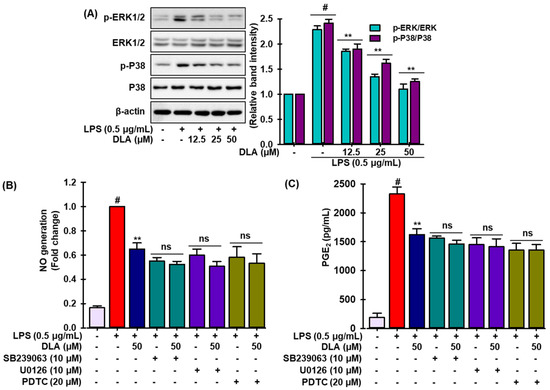 Inhibition of mitogen activated protein kinases (MAPKs) phosphorylation by DLA. A 96-well plate was seeded with cells (2 × 105 cells/mL) and incubated for 24 h. Following this, the cells were exposed to DLA (12.5–50 µM) or vehicle alone for 20 h and/or for 3 h, then to LPS (500 ng/mL), and finally they were incubated for 30 min. In LPS-stimulated RAW 264.7 cells, the effects of DLA on extracellular signal-regulated kinases (ERKs) and p38 mitogen-activated protein kinases (p38), phosphorylation were examined, and the relative change was calculated (A) # p < 0.05 vs. treatment with vehicle control; ** p < 0.05 vs. treatment with LPS alone. NO production (B) and ROS generation (C) in the presence of various inhibitors were determined according to the method described in the Materials and Methods section. # p < 0.05 vs. treatment with vehicle control; ** p < 0.05 vs. treatment with LPS alone, ns: non-significant vs. treatments with the respective inhibitors alone.