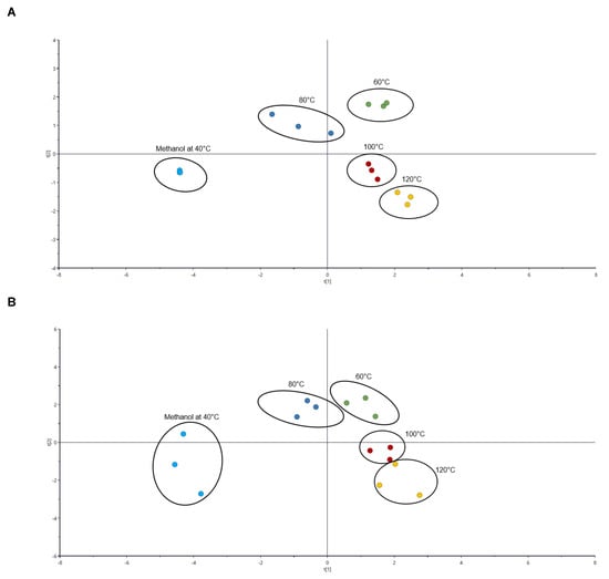 PCA score plot of (A) LC-UV profile at UV 254 nm and (B) LC-MS profile of orange peel extracts obtained from the different extraction conditions (PHWE 60 °C, PHWE 80 °C, PHWE 100 °C, PHWE 120 °C, Methanol 40 °C).
