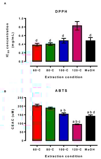 Antioxidant activity of OPWE obtained from different extraction conditions was evaluated two different assays, (A) DPPH and (B) ABTS. (A) Inhibitory concentration (IC50) value from concentration response curve of OPWE obtained from different extraction conditions. (B) CEAC of OPWE obtained from different extraction conditions. Each bar is represented by mean ± SEM, n = 5. a, significantly different to 60 °C extraction temperature; b, significantly different to 80 °C extraction temperature; c, significantly different to 100 °C extraction temperature; d, significantly different to 120 °C extraction temperature; p < 0.05, one-way ANOVA, Tukey’s post hoc test.
