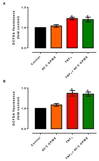 Intracellular levels of ROS in HMEC-1 cells in the absence (control) and in presence of either 1 mg/mL OPWE alone ((A): 60 °C PHWE, (B) 80 °C PHWE), 1 ng/mL TNFα alone, or the combination of TNFα + OPWE treatment for 24 h. Each bar is represented by mean ± SEM, n = 5. *, significantly different to control; p < 0.05, one-way ANOVA, Tukey’s post hoc test.