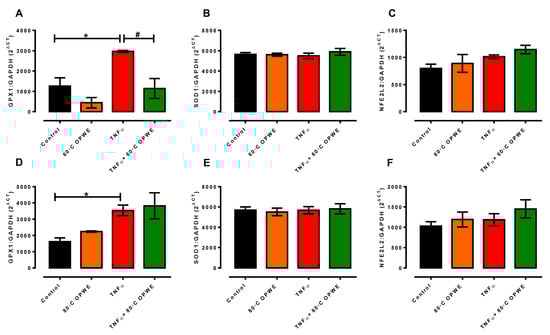 Quantitative analysis of (A,D) Gpx1, (B,E) Sod1, and (C,F) Nfe2l2 mRNA expression in the absence (control) or in presence of either 1 mg/mL OPWE alone (A–C: 60 °C PHWE, D–F: 80 °C PHWE), 1 ng/mL TNFα alone, or the combination of TNFα + OPWE treatment for 24 h. Each bar is represented by mean ± SEM, n = 3–5. *, significantly different to control; #, significantly different to TNFα alone; p < 0.05, one-way ANOVA, Tukey’s post hoc test.