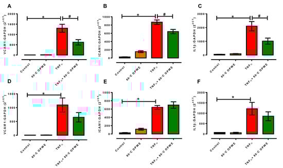 Quantitative analysis of (A,D) vcam1, (B,E) icam1, and (C,F) Il1β mRNA expression in the absence (control) or in presence of either 1 mg/mL OPWE alone (A–C: 60 °C PHWE, D–F: 80 °C PHWE), 1 ng/mL TNFα alone, or the combination of TNFα + OPWE treatment for 24 h. Each bar is represented by mean ± SEM, n = 3–5. *, significantly different to control; #, significantly different to TNFα alone; p < 0.05, one-way ANOVA, Tukey’s post hoc test.