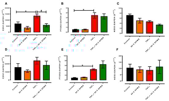 Quantitative analysis of (A,D) Edn1, (B,E) Ptgs2, and (C,F) Nos3 mRNA expression in the absence (control) or in presence of either 1 mg/mL OPWE alone ((A–C): 60 °C PHWE, (D–F): 80 °C PHWE), 1 ng/mL TNFα alone, or the combination of TNFα + OPWE treatment for 24 h. Each bar is represented by mean ± SEM, n = 3–5. *, significantly different to control; #, significantly different to TNFα alone; p < 0.05, one-way ANOVA, Tukey’s post hoc test.
