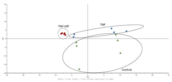 PCA score plot of the metabolic profile of HMEC-1 cells after 24 h treatment of control: 60 °C OPWE (1 mg/mL) or co-treated with TNF-α (1 ng/mL) and 60 °C OPWE (1 mg/mL). Some of the key metabolites determined are shown in Table 2 (n = 5–6).
