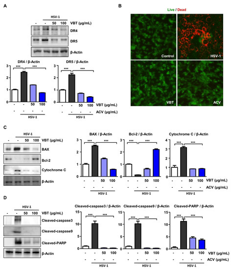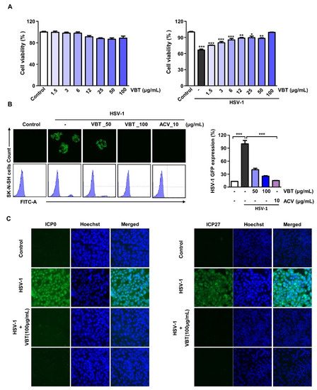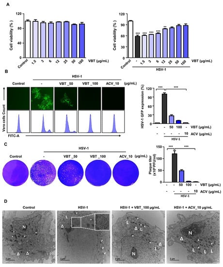 3.1. VBT Inhibits Cytotoxicity and Viral Activity upon HSV-1 Infection in Vero Cells