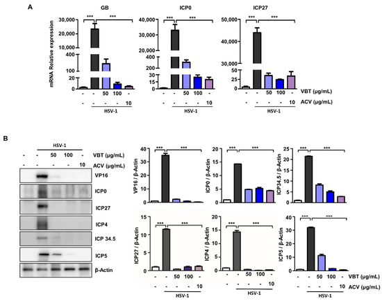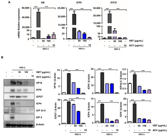 3.2. VBT Inhibits mRNA and Protein Expression of Genes Involved in HSV-1 DNA Replication and Proliferation in Vero Cells