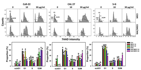Cell cycle analysis. Except for S-G cells, others were oral cancer cells. After pretreating with NAC, cells were post-treated with MECI (0 (0.1% DMSO in the medium), 10, and 30 μg/mL) for 24 h and applied to the flow cytometry. Data, mean ± SD (n = 3). For the same cell line, columns showing non-overlapping letters differ significantly (p < 0.05).