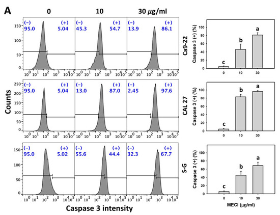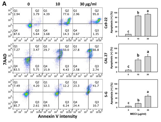 In addition to subG1-increasing effects, it is essential to assess apoptosis by additional methods. Using annexin V/7ADD detection, MECI enhanced the annexin V (+) % of oral cancer cells (Figure 4A), which is an advanced indicator of apoptosis. For comparison, non-malignant cells (S–G) showed lower annexin V (+) % than oral cancer cells.