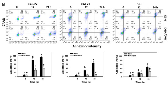 Annexin V-detected apoptosis. (A) Annexin V/7AAD. Except for S-G cells, others were oral cancer cells. After 24 h MECI incubation (0 (0.1% DMSO in the medium), 10, and 30 μg/mL), cells were subjected to flow cytometry. Annexin V (+)/7AAD (+/−) spots were specified for apoptosis (+). (B) Impact of NAC on MECI-induced apoptosis changes to oral cancer cells. After pretreating with NAC, cells were post-treated with MECI (30 μg/mL) for 0, 12, and 24 h. Data, mean ± SD (n = 3). For the same cell line, columns showing non-overlapping letters differ significantly (p < 0.05).
