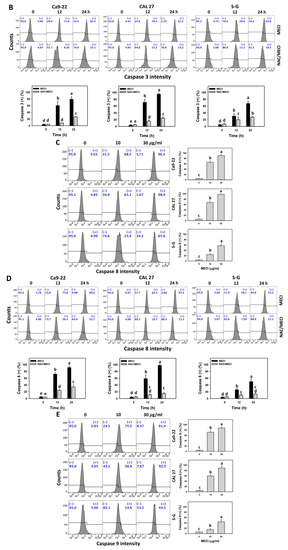 In addition to annexin V-increasing status, it is essential to assess apoptosis by more methods. Using caspase activation analysis (Figure 5A,C,E), MECI increased the Cas 3/8/9 (+) % of oral cancer cells, which is an advanced indicator of apoptosis in triggering caspase signaling. For comparison, non-malignant cells (S–G) exhibited lower Cas 3/8/9 (+) % than oral cancer cells.