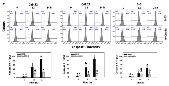 The impact of ROS on the regulation of the Cas 3/8/9 (+) by MECI was assessed using an ROS inhibitor (NAC). The Cas 3/8/9 (+)-increasing status of MECI in oral cancer and non-malignant (S–G) cells at time-lapse was inhibited by pretreatment with NAC (Figure 5B,D,F).