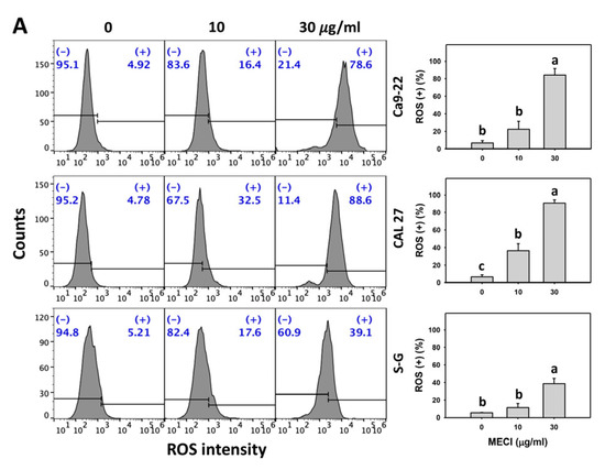 The effects of the antioxidant NAC were assessed above. Consequently, oxidative stress in terms of ROS was examined in MECI-treated cells. Based on graphs and statistics presented in Figure 6, there is a difference between the Ca9-22 (84.2%) and CAL 27 (90.7%) vs. S–G (38.6%) cells with regard to ROS generation after 30 μg/mL MECI treatment (Figure 6A). Using flow cytometry analysis, MECI increased the ROS (+) % of oral cancer cells (Figure 6A), which is an indicator of oxidative stress. For comparison, non-malignant cells (S–G) exhibited lower ROS (+) % than oral cancer cells.
