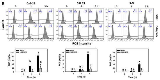 ROS assay. (A) ROS change. Except for S-G cells, other cells were oral cancer cells. After 3 h MECI incubation (0 (0.1% DMSO in the medium), 10, and 30 μg/mL), cells were applied to an ROS assay. (+) spots were specified for ROS (+). (B) Impact of NAC on MECI-induced ROS change to oral cancer cells. After pretreatment with NAC, cells were post-treated with MECI (30 μg/mL) for 0, 1, and 3 h. Data, mean ± SD (n = 3). For the same cell line, columns showing non-overlapping letters differ significantly (p < 0.05).