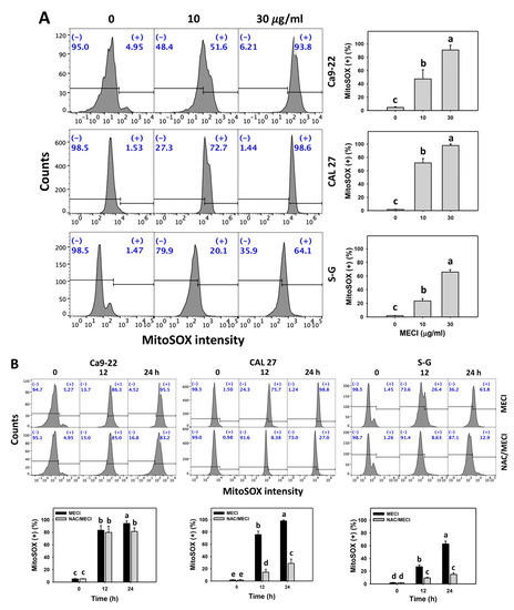 MitoSOX assay. (A) MitoSOX change. Except for S-G cells, other cells were oral cancer cells. After 24 h MECI incubation (0 (0.1% DMSO in the medium), 10, and 30 μg/mL), cells were subjected to a MitoSOX assay. (+) spots were specified for MitoSOX (+). (B) Impact of NAC on MECI-induced MitoSOX change to oral cancer cells. After pretreatment with NAC, cells were post-treated with MECI (30 μg/mL) for 0, 12, and 24 h. Data, mean ± SD (n = 3). For the same cell line, columns showing non-overlapping letters differ significantly (p < 0.05).